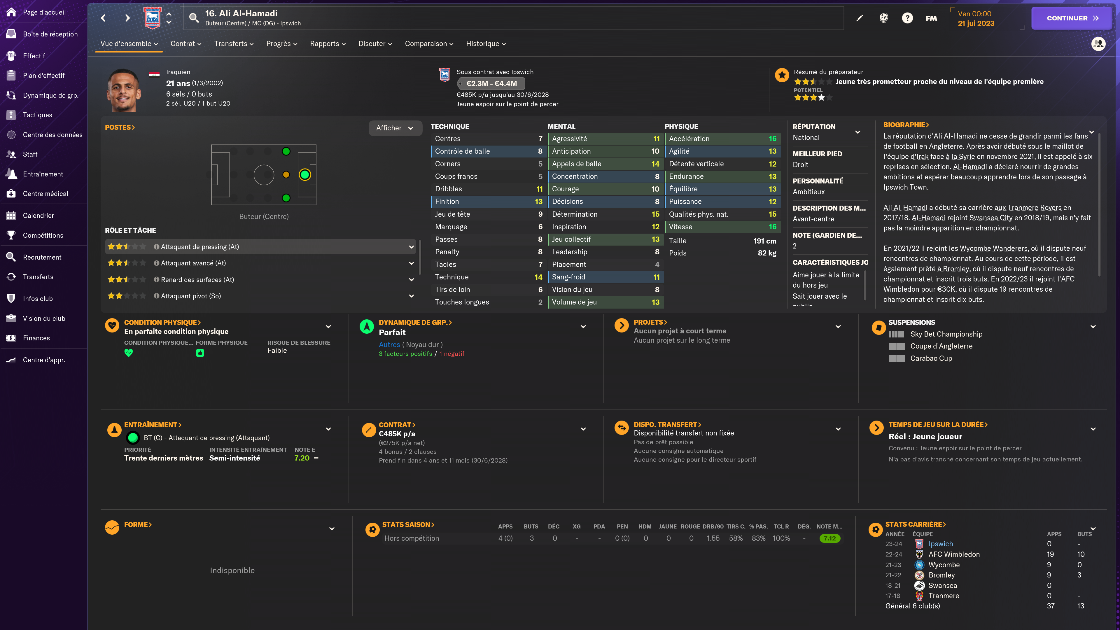 Ces efforts n'ont pas manqué d'attirer l'attention de l'équipe de recrutement d'Ipswich, mais aussi celles de nos analystes et observateurs. L'international irakien a bénéficié d'une amélioration significative à son Niveau actuel dans FM24, tandis que dans la vie réelle, il a la tâche de venir ajouter de l'efficacité offensive dans la quête d'Ipswich de sécuriser deux promotions d'affilée.
