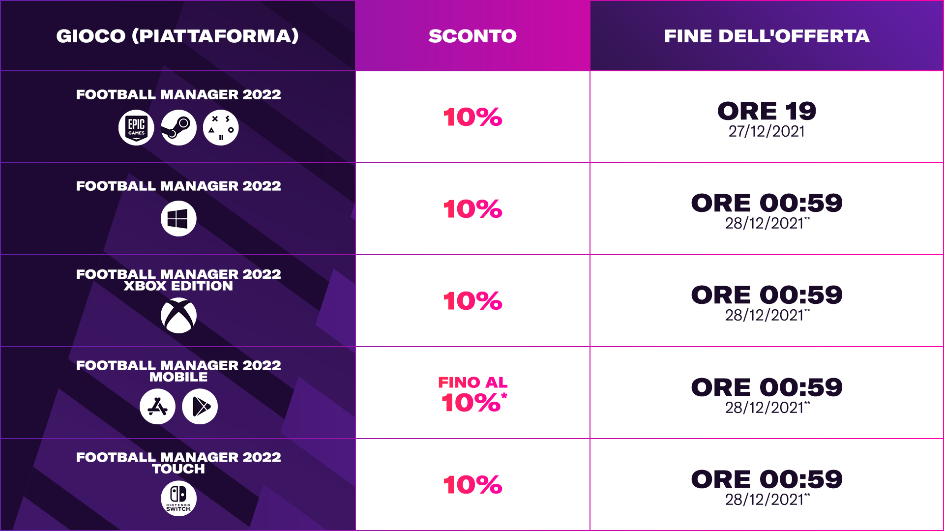 Zur deutschen SeiteScegli il compagno perfetto per le festività con Football Manager 2022 e risparmia il 10% su tutte le piattaforme.
