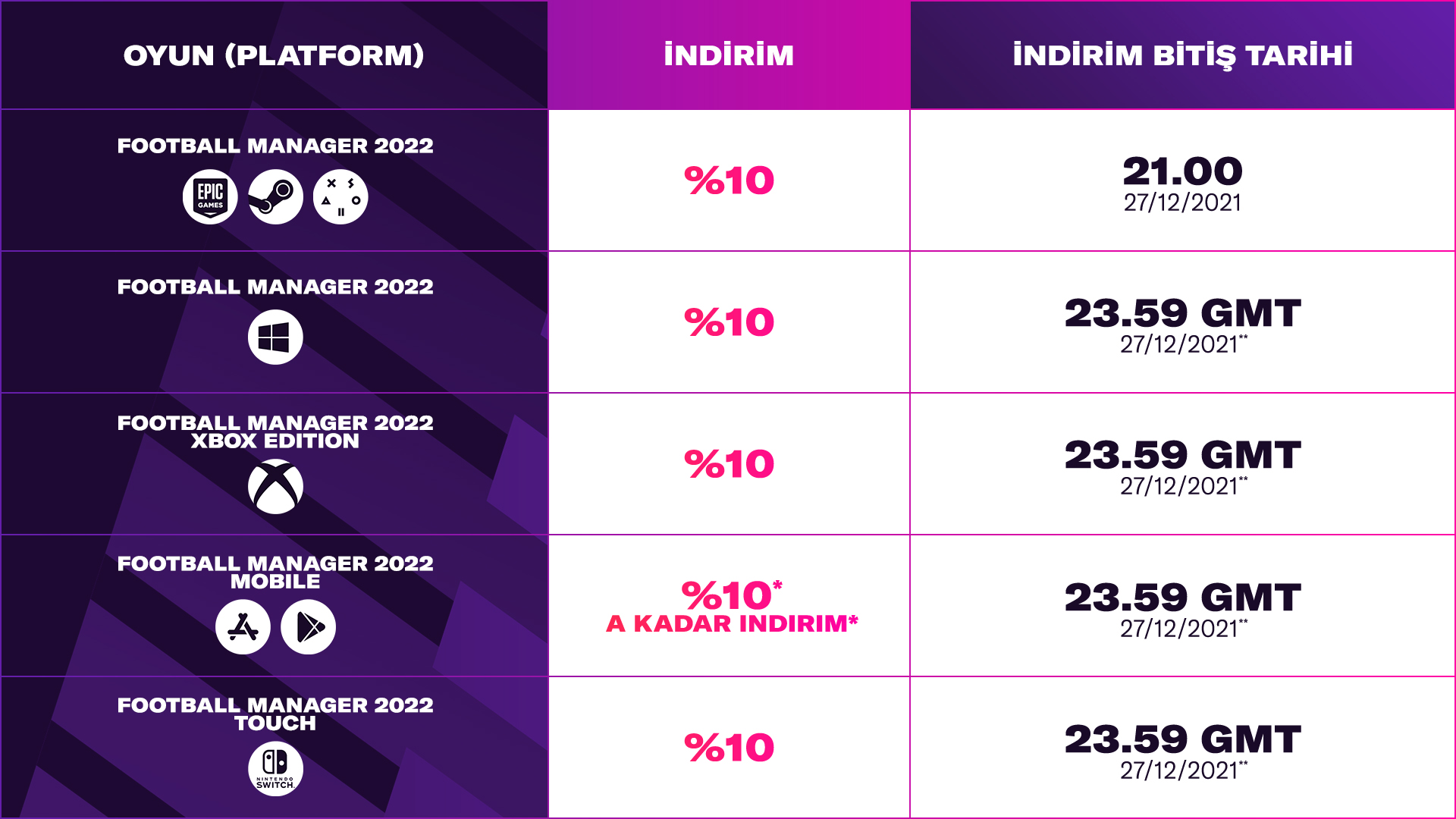 Zur deutschen SeiteŞimdi tüm platformlarda %10'a varan indirimli Football Manager 2022 ile tatil dönemi ruhu için en ideal arkadaşı alın.