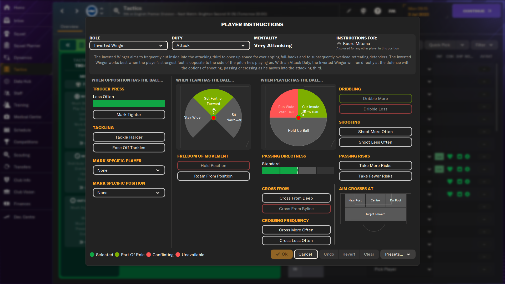 Regardless of which wide player roles you choose to use him in, Mitoma’s effectiveness is enhanced even further by the Shoot Less Often and Take More Risks Player Instructions. These will encourage him to be patient while in possession, particularly further away from the goal, meaning he has more avenues to pursue either mazy dribbles or lower-percentage passes.