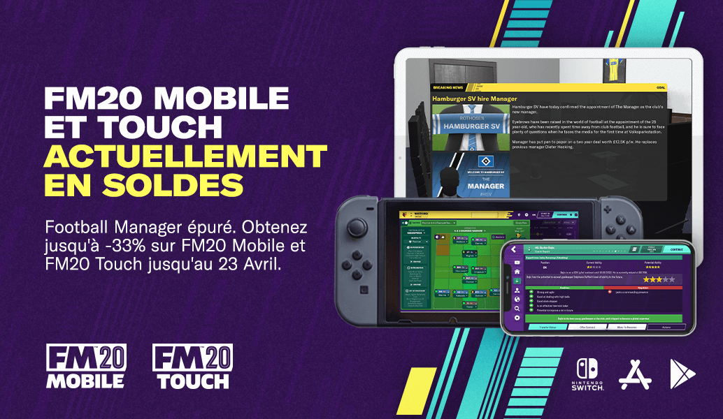 FM20 Mobile (iOS, Android) et FM20 Touch (iOS, Android et Nintendo Switch) bénéficient d'une réduction pouvant aller jusqu'à -33 % sur les boutiques associées jusqu'au jeudi 23 avril à 23:59 (BST).