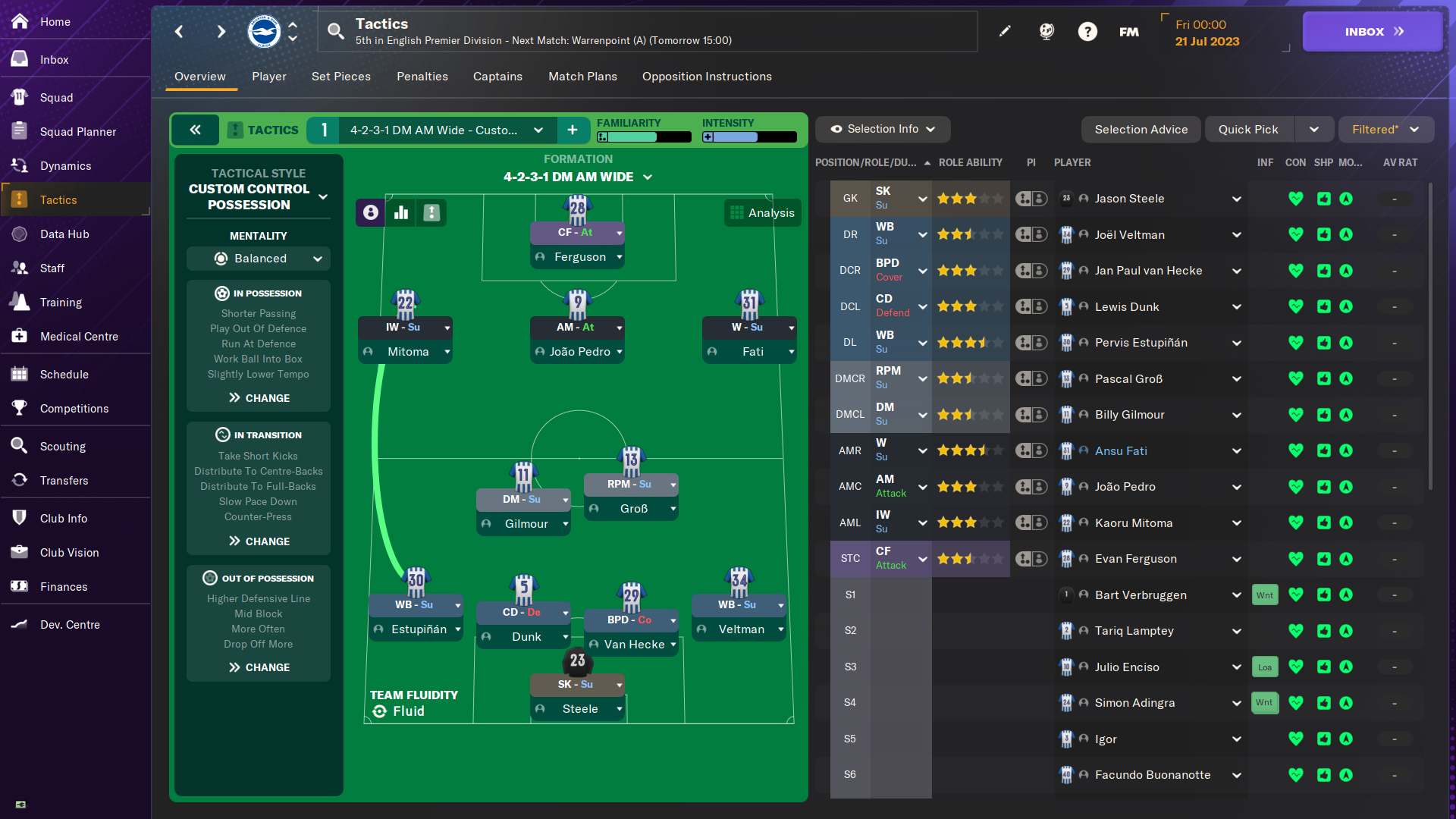 Brighton boss Roberto De Zerbi has interchanged frequently between a 4-2-3-1 shape and a 5-4-1 this season. The corresponding duties you’d use your Wing-Backs on in FM24 very much depends on which formation you go for.