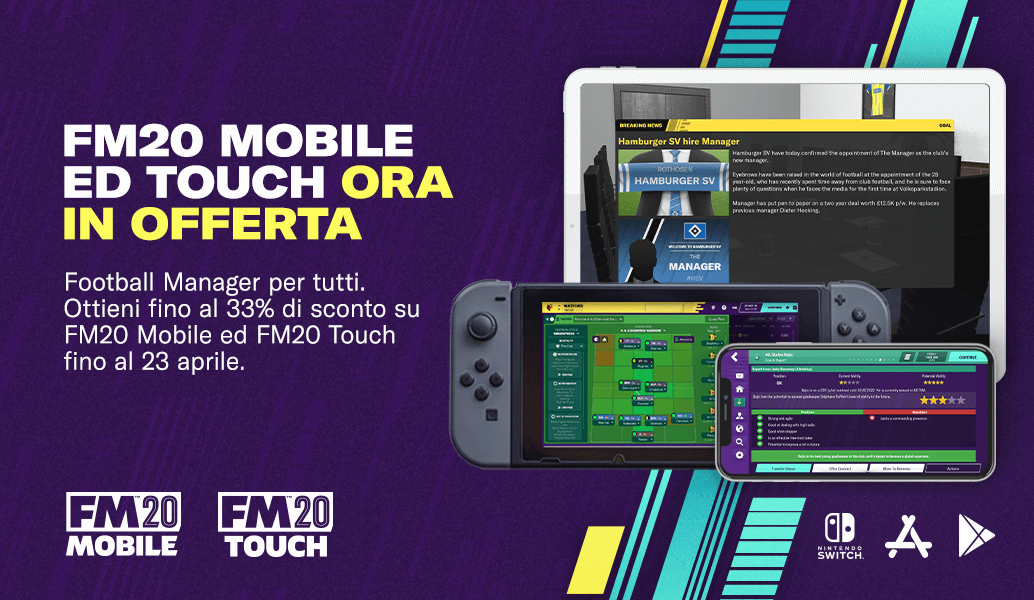 Approfitta dell'affare migliore della stagione con Football Manager 2020 Mobile e Football Manager 2020 Touch, ora in offerta.