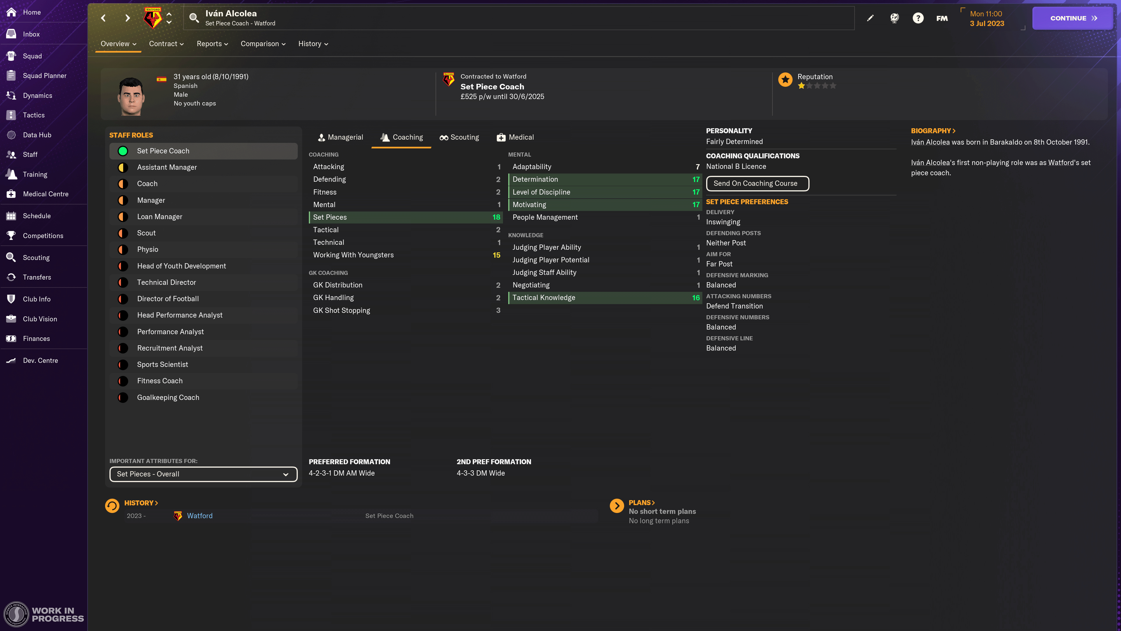 That said, the profiles of the Set Piece Coaches look a bit different to those of other coaches in previous editions of FM. Instead of a Scouting Knowledge panel on the right-hand side, you’ll now see their Set Piece preferences clearly indicated. These preferences cover everything from the sort of delivery style they prefer to how they like to set up defensively.